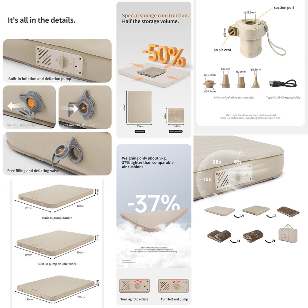 با وجود ابعاد سخاوتمندانه 200 در 150 سانتیمتر در حالت باز، این زیرانداز در حالت بسته به یک بسته فشرده با وزن تنها 5 کیلوگرم تبدیل میشود. با استفاده از یک پمپ باد (که به صورت جداگانه تهیه میشود)، در چند دقیقه کوتاه، شاهد جان گرفتن و تبدیل شدن آن از یک بسته جمعوجور به یک بستر وسیع و دعوتکننده باشید. این فرآیند سریع به شما اجازه میدهد تا در کمترین زمان ممکن، فضای استراحت خود را آماده کنید.