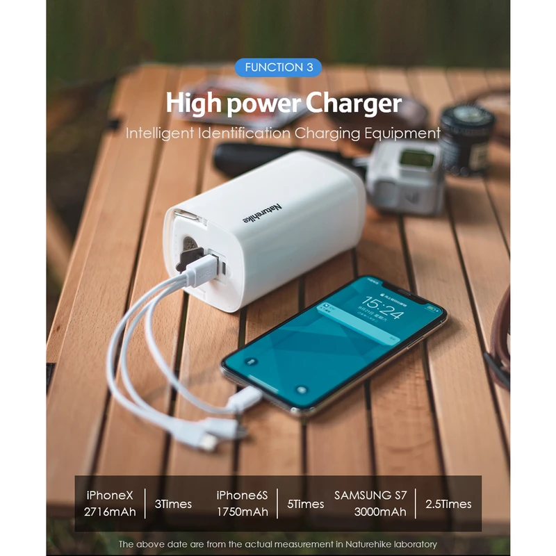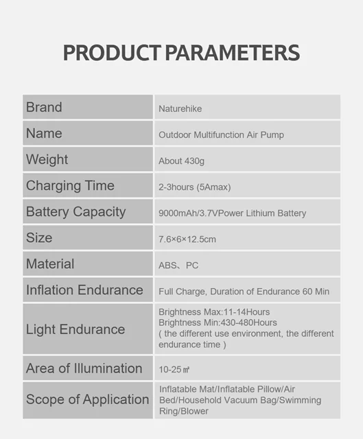 - از پمپ باد شارژی نیچرهایک با داشتن چندین نازل برای باد کردن اکثر وسایل بادی همچنین به عنوان چراغ یا پاوربانک استفاده می شود.