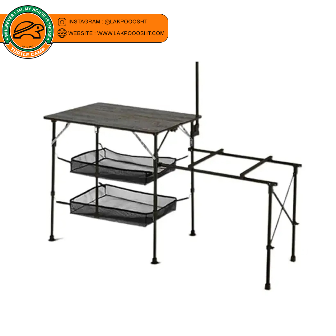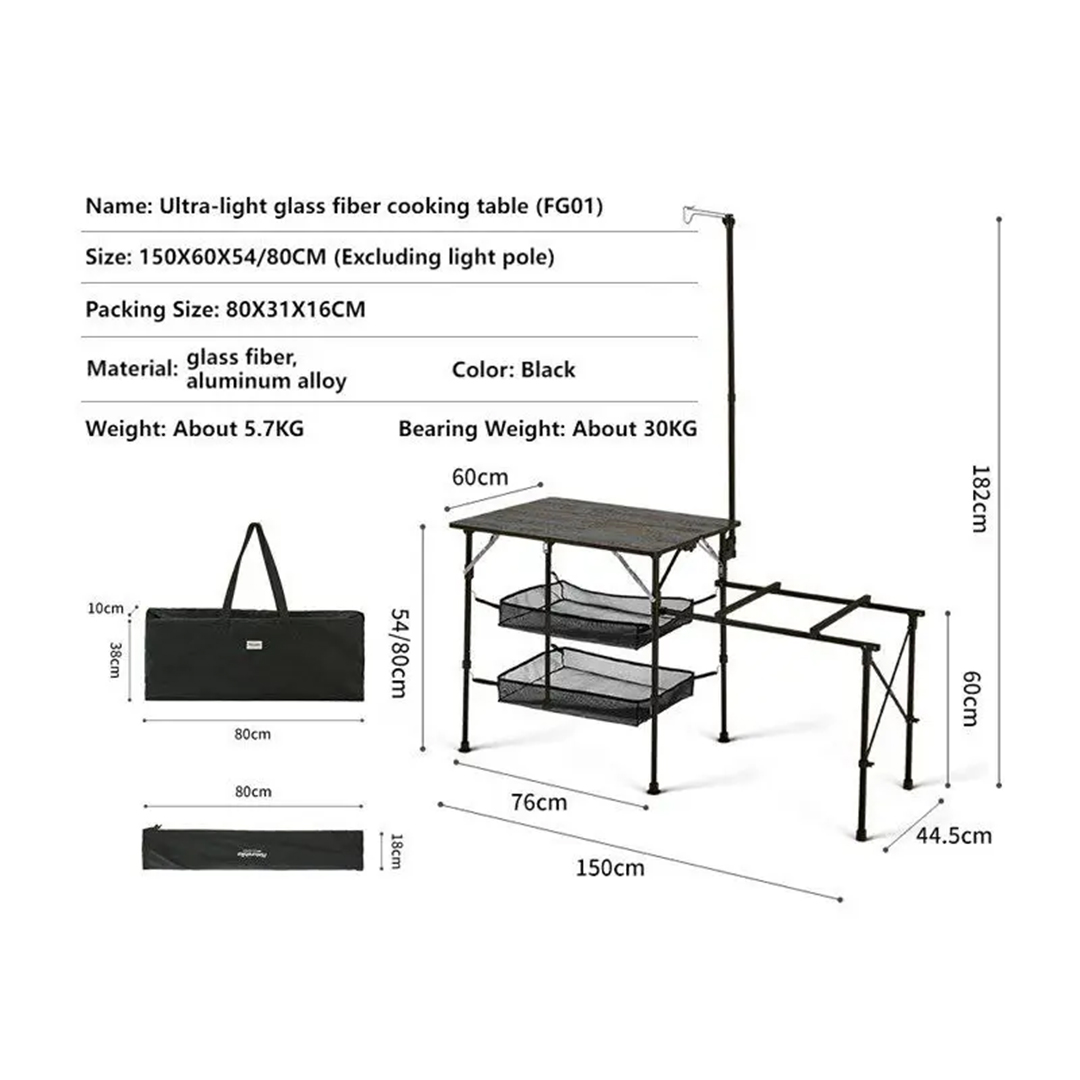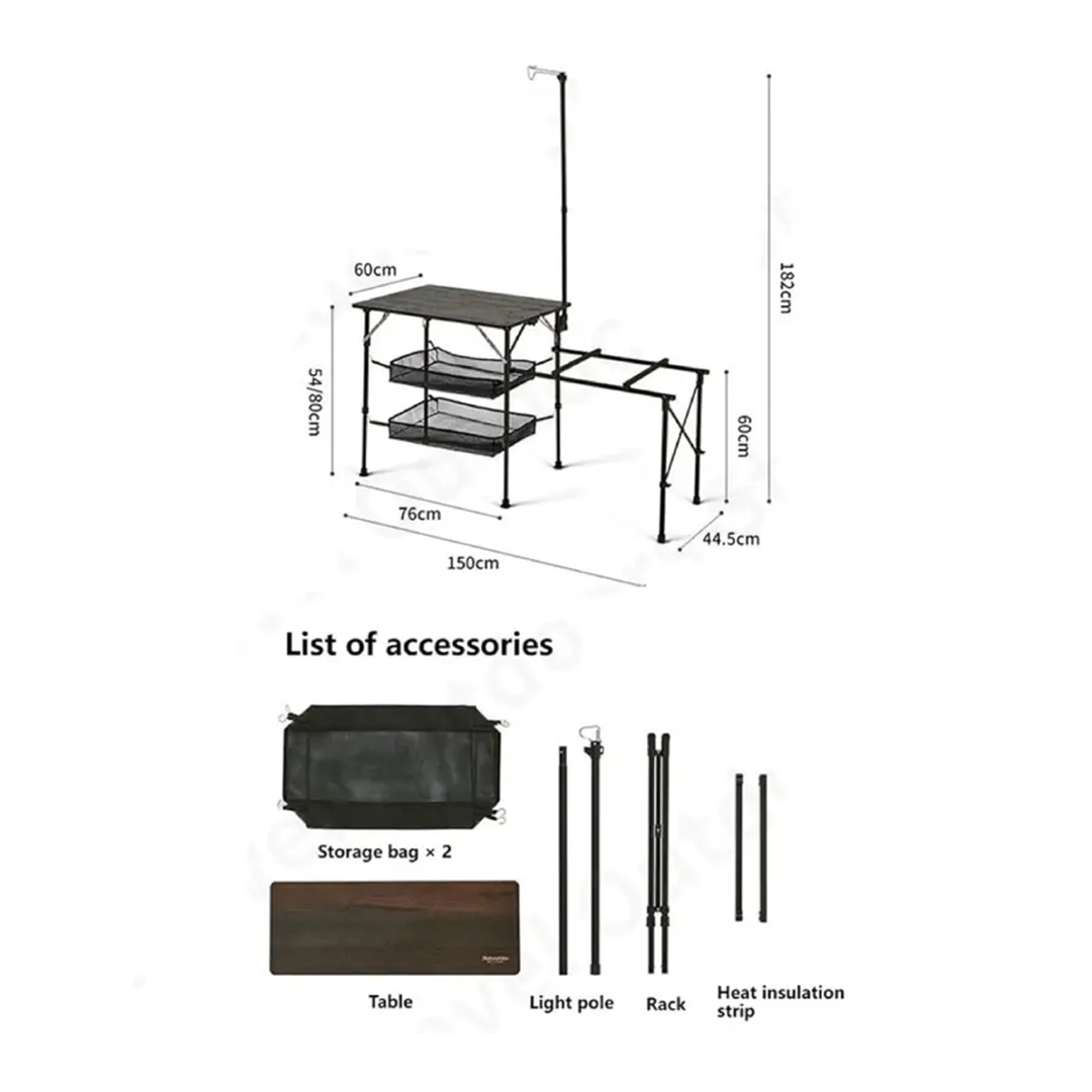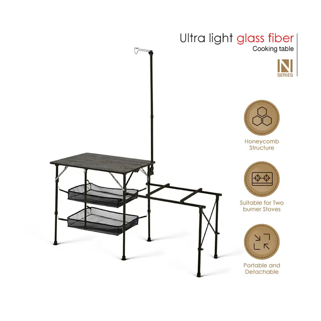 میز آشپزی نیچرهایک ، یک میز کمپینگ تاشو و سبک با جنس آلومینیوم و الیاف شیشه، مناسب برای آشپزی در فضای باز، کمپینگ و طبیعتگردی. دارای سبدهای توری، پایه چراغ و نصب آسان. وزن کم و مقاومت بالا.